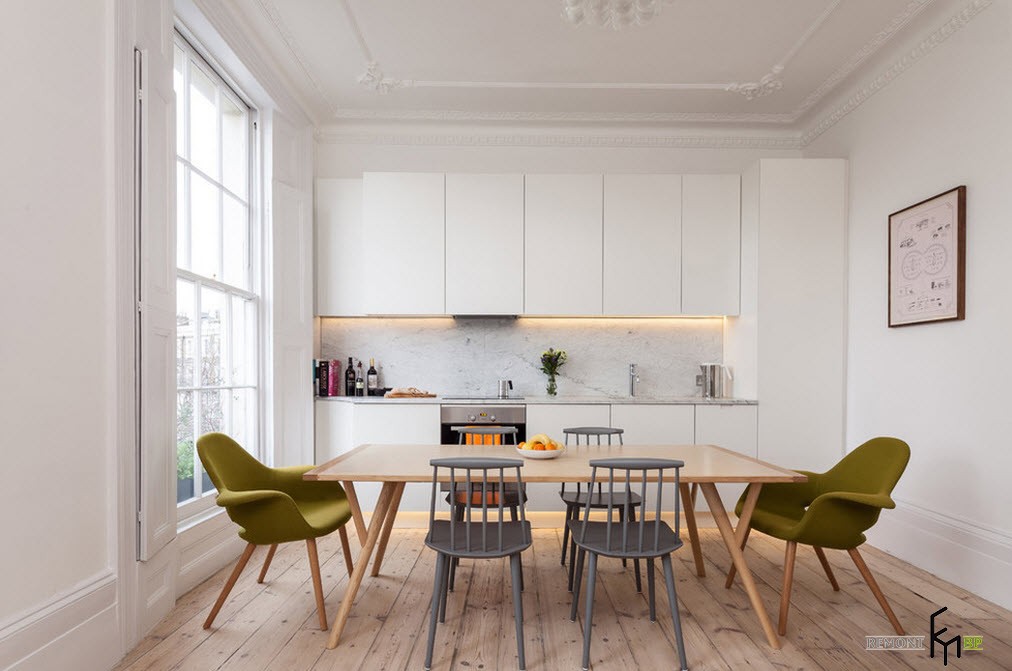 Не менее оригинально выглядят столы, в которых столешница из неокрашенного натурального дерева. Такая деталь которая и объединяет стиль всей столовой: