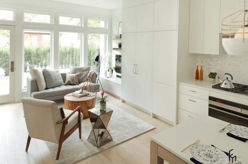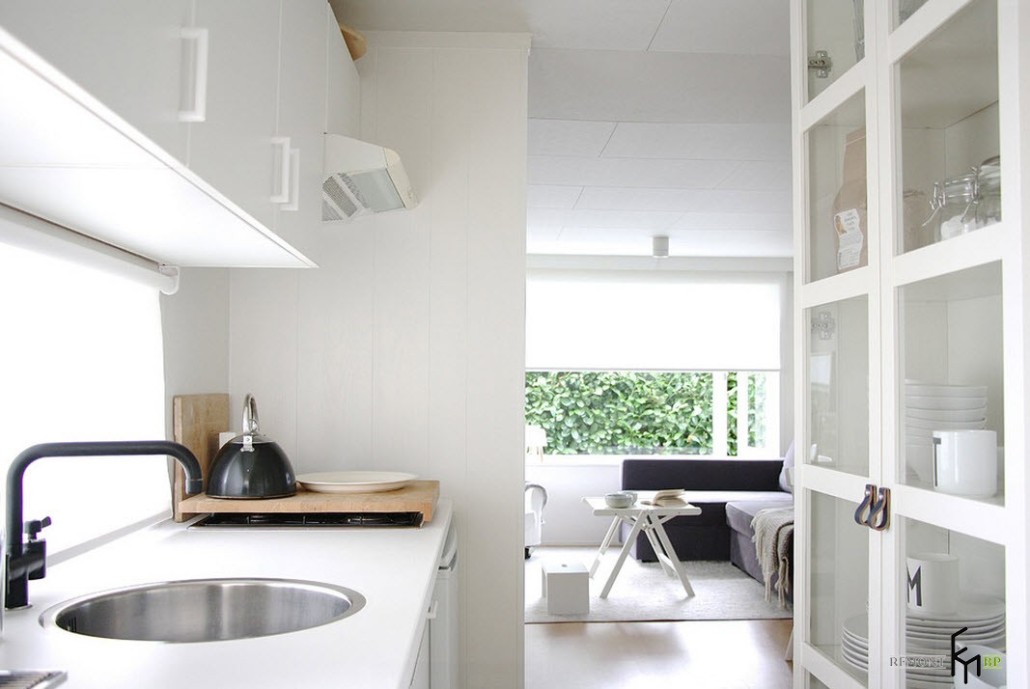 Для потолка используют аналогичные материалы и способы дизайна. Так, белый ровный потолок создаст единое целое со стенами и предметами мебели:
