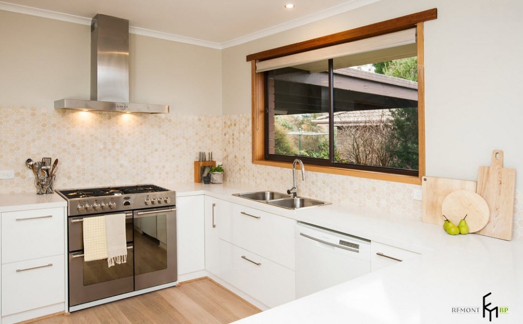 Декорирование стен в кухнях предполагает использование материалов белого или цвета натурального дерева. Гладкие матовые белоснежные или других светлых тонов покрытия – это современный вариант оформления. Подобный способ создает ауру чистоты и визуально увеличивает площадь кухни: