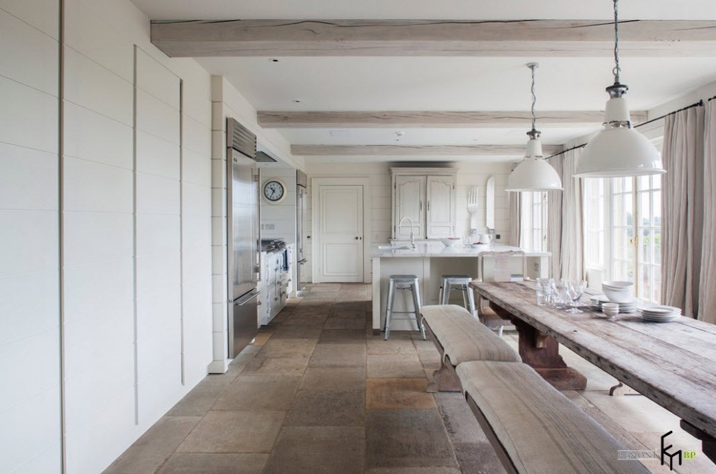 Очень эффектно выглядят потолочные балки, выпущенные наружу. Такие конструкции могут быть контрастными или однотонными со стенами: