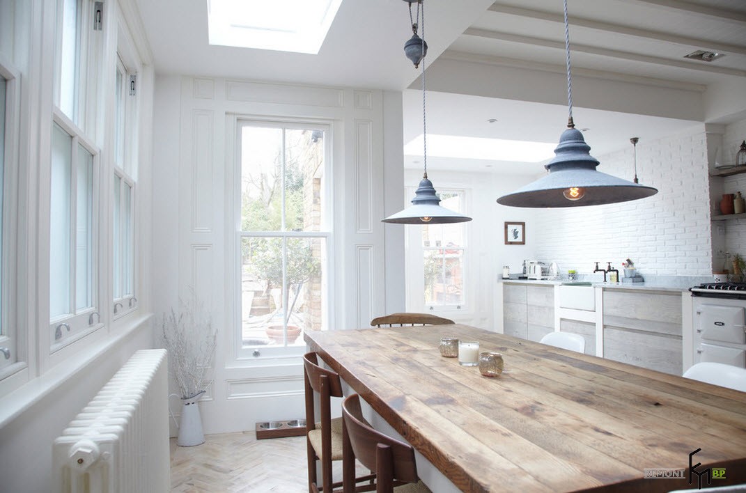 Кухни, как и другие комнаты в скандинавском стиле, должны быть наполнены светом, предпочтительно естественным. В этой связи окна в кантри Скандинавии всегда большие. Как и все другие детали интерьера, они не требуют никаких украшений. Сдержанный дизайн простого цельного окна на кухне в деревянной раме – это эталон остекления скандинавского стиля:
