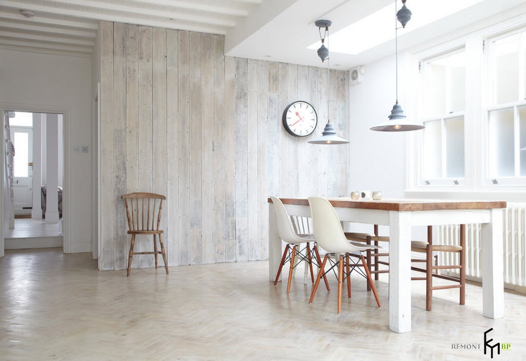 Напольное покрытие может контрастировать по цвету со стенами. Более темный пол – это и практично, и оригинально. Налет винтажности придаст интерьеру пол, выложенный плиткой из древесины с эффектом браширования: