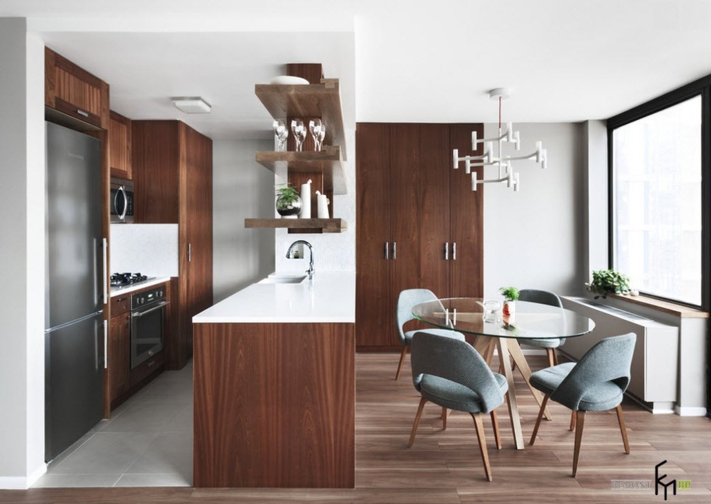 Как уже упоминалось, основные требования к выбору мебели – это ее практичность и сдержанный дизайн. Главное, чтобы все было под рукой, поэтому в зоне приготовления пищи необходимо сосредоточить основные бытовые приборы и соответствующие предметы мебели: