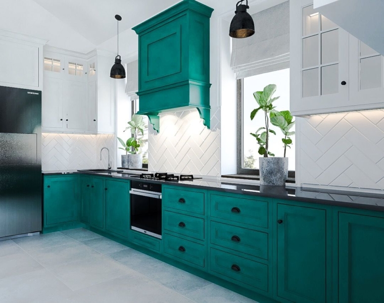 Бирюза — очень модный и удачный выбор, особенно в случае с кухней. Она свежая и современная, а также создает множество интересных вариантов оформления. Идеально сочетается с различными стилями, включая ретро, современный и средиземноморский.