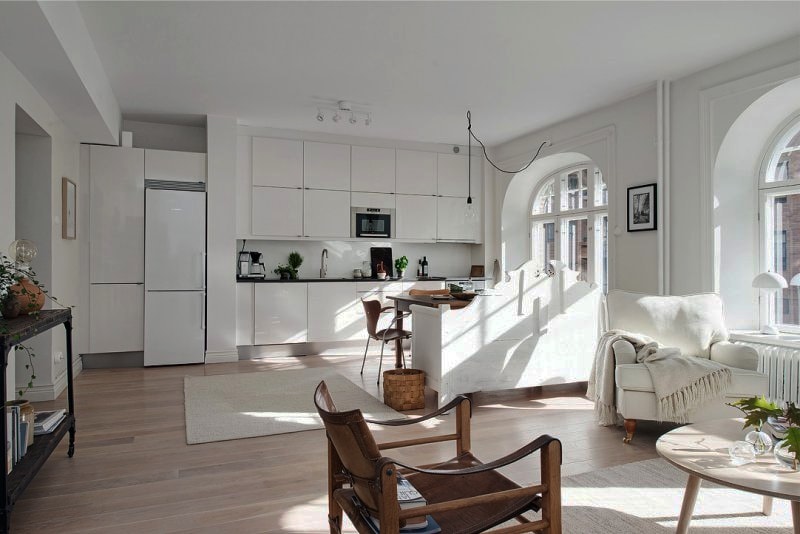 Как пользоваться «правилом треугольника» на кухне? На самом деле, некоторые эксперты даже советуют разделить визуально большую комнату, где будет открытая кухня. Вам просто нужно применить общие нормы оформления интерьера кухни и гостиной. Следуйте, например, «правилу треугольника» на кухне. Если вы не знакомы с этим принципом, вот что вам нужно знать, чтобы легко спроектировать комнату. Принцип действия треугольника гласит, что на любой кухне все вращается вокруг трех основных элементов: холодильника, раковины и плиты (духовки). Эти три элемента предпочтительно должны располагаться на более или менее идентичном расстоянии друг другу. Применяя такой принцип в своем плане кухни, вы облегчите ее сочетание с гостиной, и, кроме того, будете наслаждаться большей свободой передвижения. Хорошая идея для тех, кто любит экспериментировать на кухне! Затем вы можете подумать о средствах, которые будете применять, чтобы фактически разграничить области комнаты. Они включают в себя не только кухонные острова, но и барные стойки, небольшую мебель, полки и книжные шкафы.