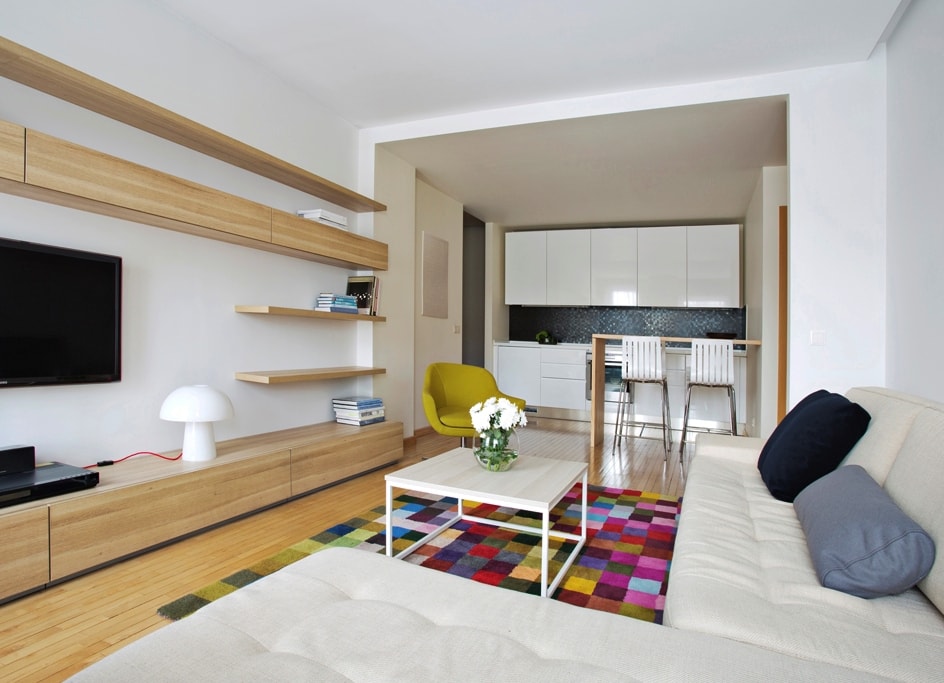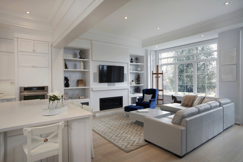 В небольшой кухне, открытой для гостиной, ковер — это аксессуар с множеством функций. Он также имеет возможность указывать границы области в большом открытом пространстве. Чаще всего квадратные и прямоугольные ковры выполняют эту функцию. Они придают комнате более уютный вид.