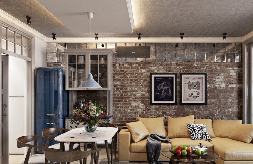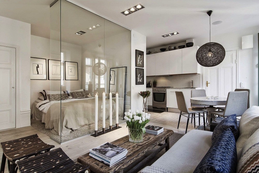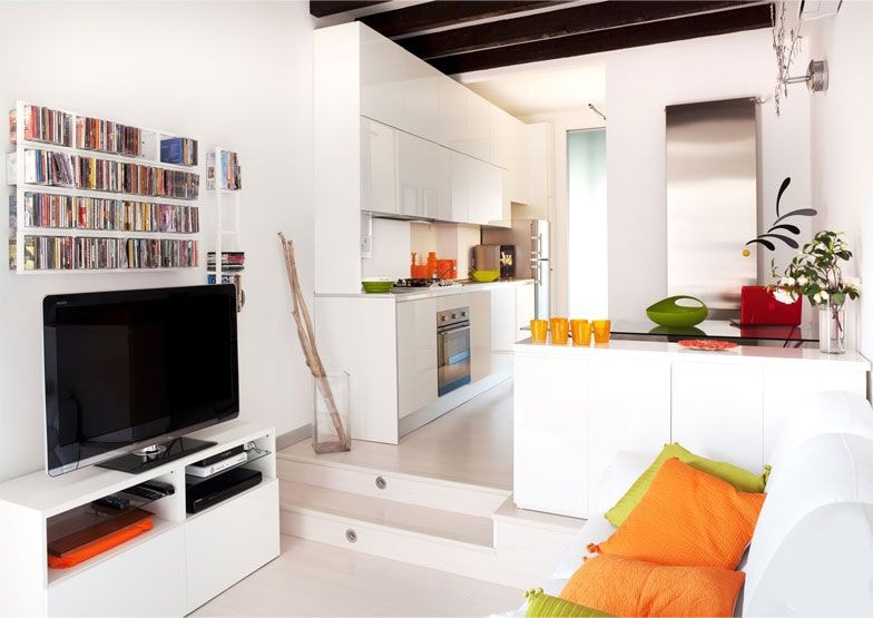Гармоничная кухня-гостиная: студия 25 кв. м с визуальным разделением пространства