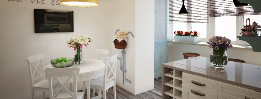 - Нужно создать единый стиль и сочетать схожие цветовые гаммы для целостности интерьера кухни и лоджии.