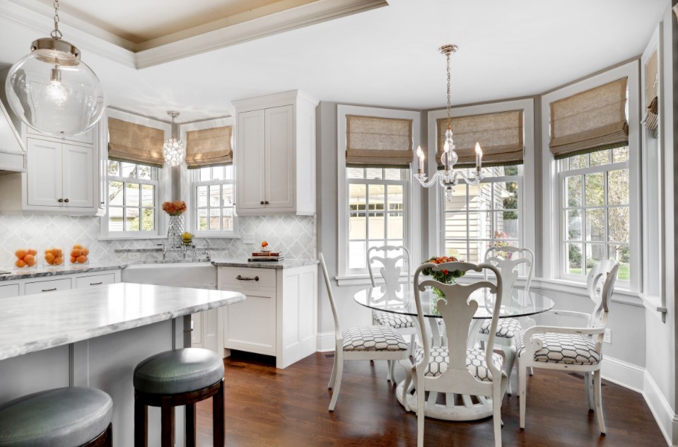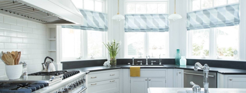 Главные отличия эркерных штор от обычных – это нестандартная форма кроя и длина, которые будут напрямую зависеть от размеров и формы эркерного кухонного окна. Также шторы для эркера стоит подбирать в зависимости от расположенной в эркере зоны. Если в эркере размещена столовая группа, то идеальным вариантом станут короткие шторы, например, римские или рулонные. Для изысканной столовой зоны в эркере отлично подойдут австрийские или французские шторы. Для отдельных стилей интерьера уместны будут японские шторы или нитяные занавески.