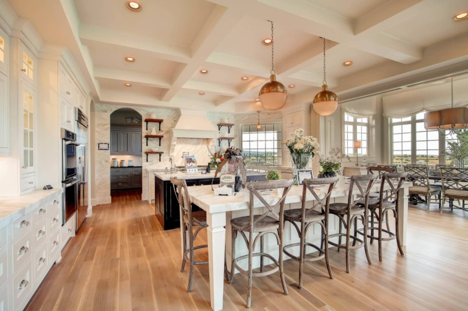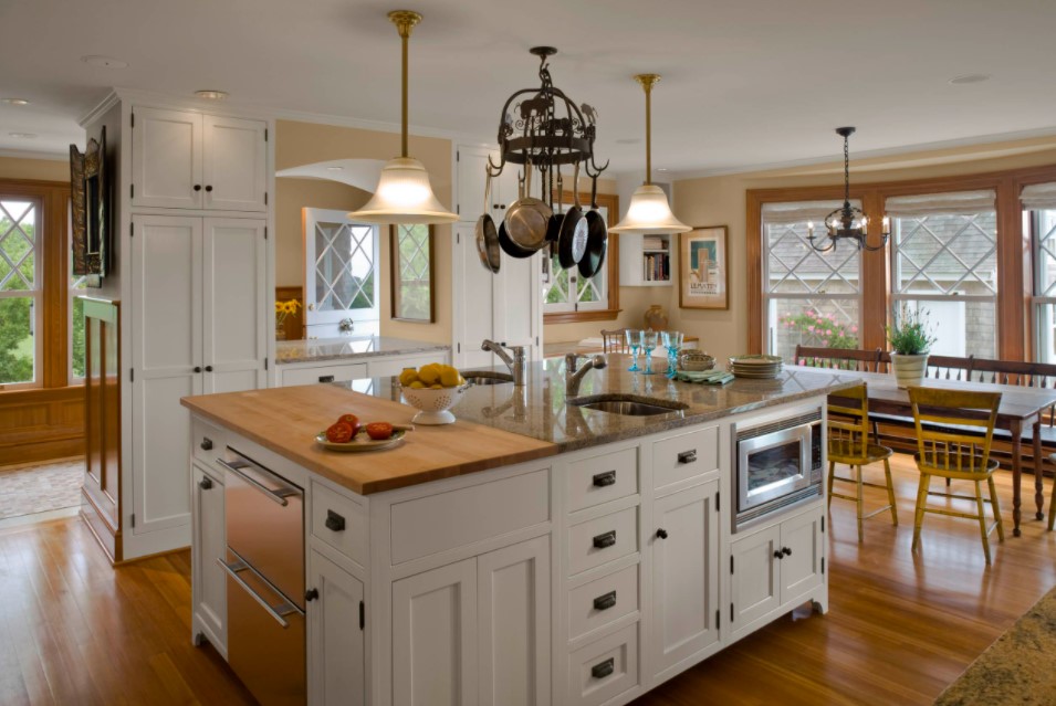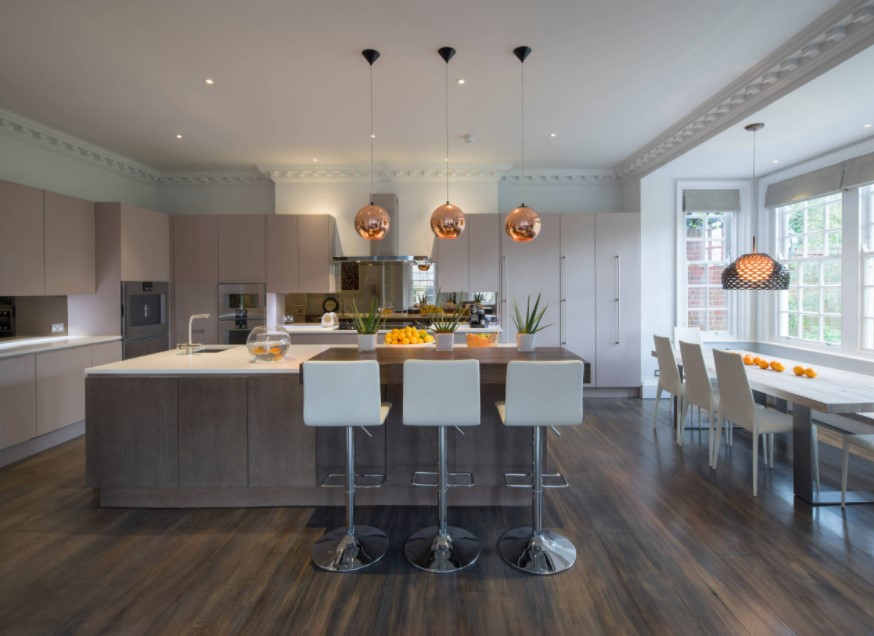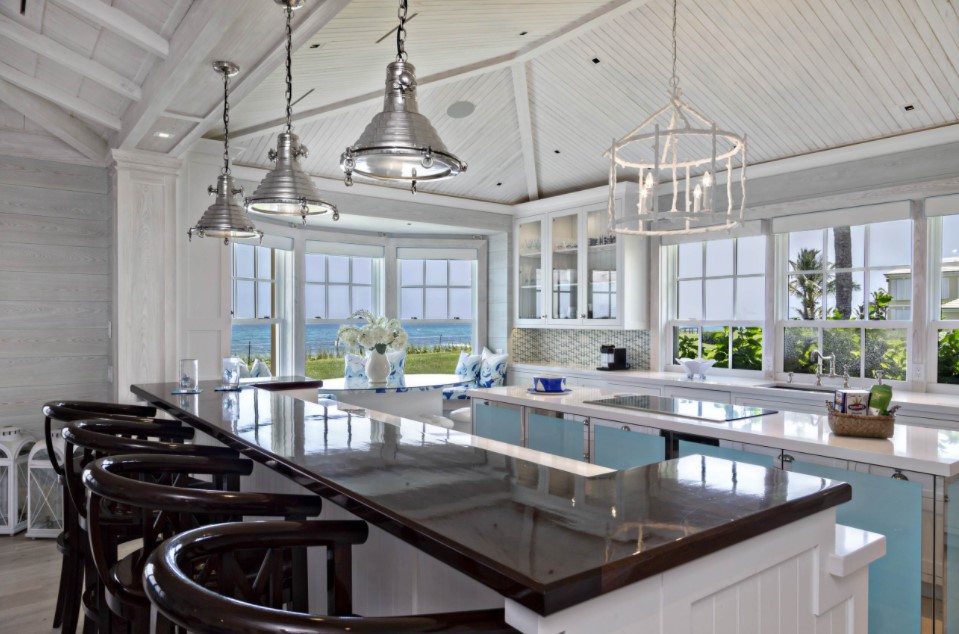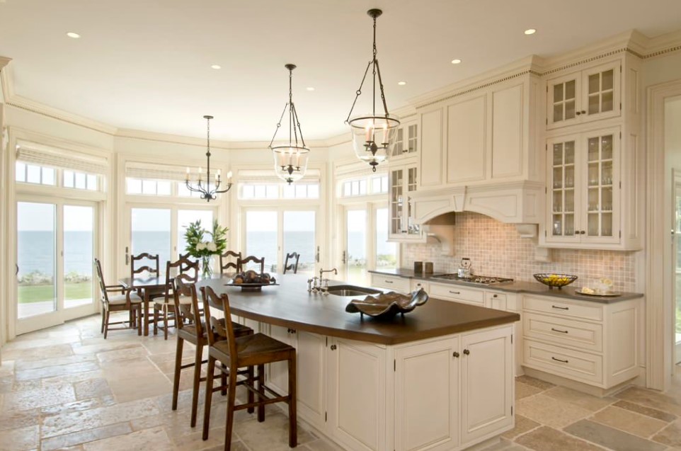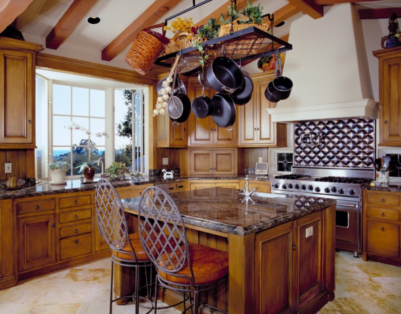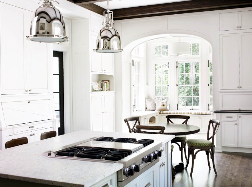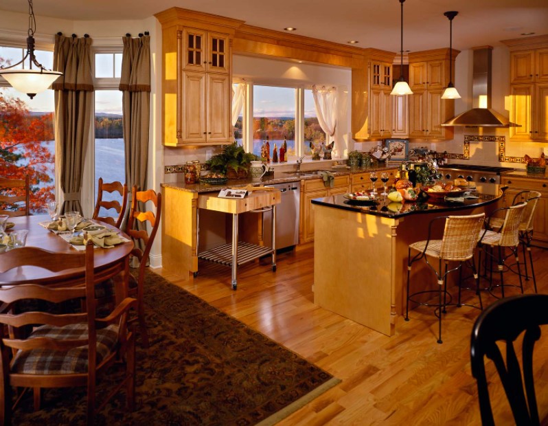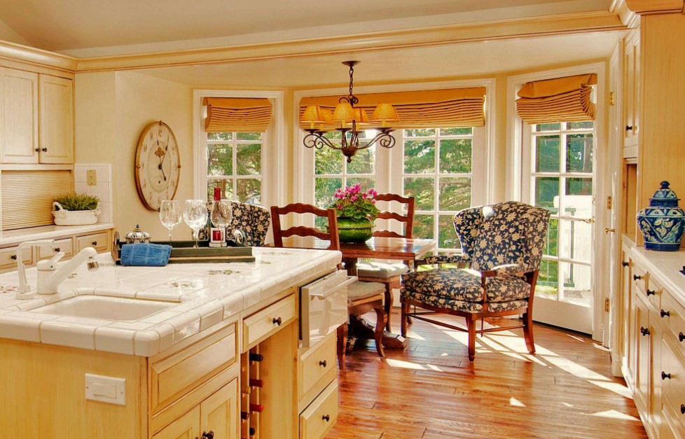 Частные дома или коттеджи с эркерами почти всегда отличаются достаточно большой площадью, в том числе кухни. Поэтому кухни частных домов с эркерами могут быть оформлены в любом понравившемся современном стиле интерьера. Наиболее удачными и уместными будут такие стили, как минимализм, модерн, классика, прованс, хайт-тек. В кухнях с достаточной площадью вопрос экономии пространства не актуален, поэтому зачастую эркер в них используют для оборудования зоны отдыха с небольшим диваном, парой кресел, небольшим столиком и великолепным живописным видом из окна. Кстати, именно в частном доме возможно панорамное остекление эркера.