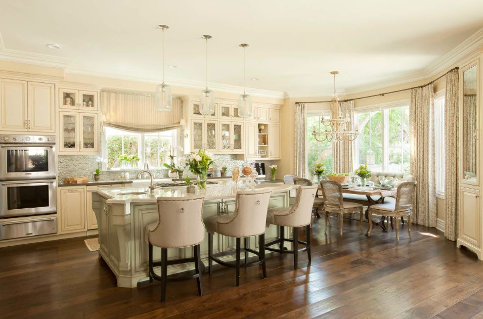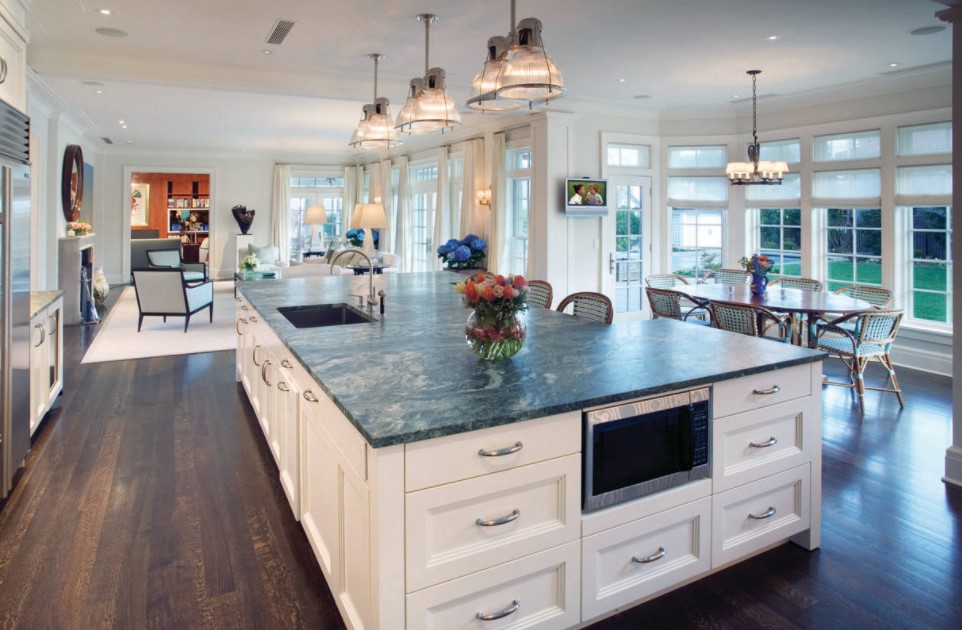 В кухне-гостиной обязательно должны быть обустроены обеденная зона со столом и мягкой мебелью; рабочая зона с плитой, мойкой, системами хранения, рабочей поверхностью; зона для отдыха, работы, рукоделия, чтения; живая зона с комнатными декоративными растениями и возможно даже с домашними питомцами. Если в доме маленький ребенок, то не лишним будет небольшой уголок для детского досуга и игр, который выручит родителей, занятых хлопотами на кухне. Любая из этих зон может быть гармонично и красиво обустроена в эркере кухни.