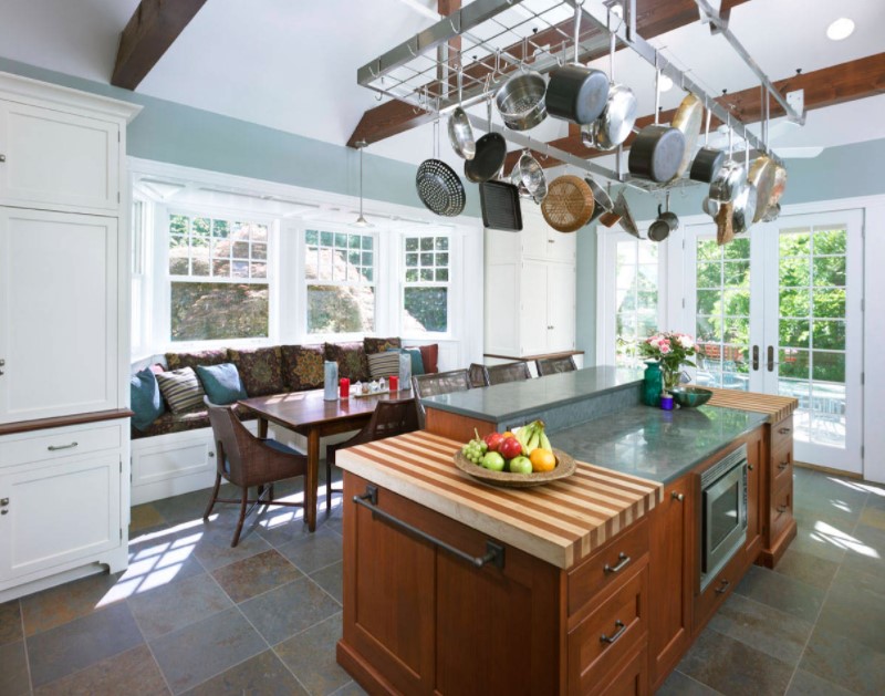 Эркер в кухне имеет различные варианты планировки и может быть использован для оборудования столовой зоны, рабочей зоны со всеми необходимыми атрибутами: столешницей, мойкой и системами хранения кухонных принадлежностей и посуды. Менее распространены, но очень уместны в эркере кухни оснащенные функциональные уголки для отдыха, чтения, занятий рукоделием, а также живые уголки с комнатными цветами, аквариумами, клетками с мелкими домашними грызунами и птицами.