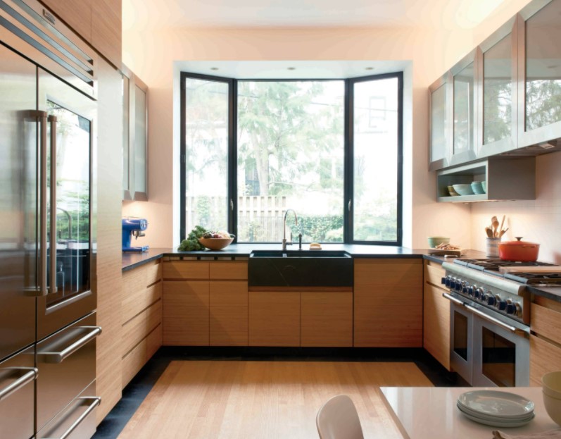 Садовое эркерное окно на кухне – это обычно самый маленький по размерам вид, который в частном доме выходит в сад, отчего и получил такое название. Самые главные преимущества эркерных окон, в частности, кухонных, это большое количество естественного света и тепла, а также очень изысканный, элегантный, необычный внешний вид.