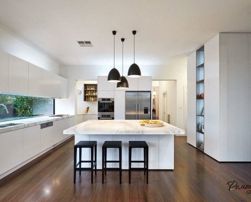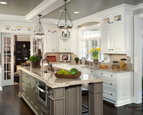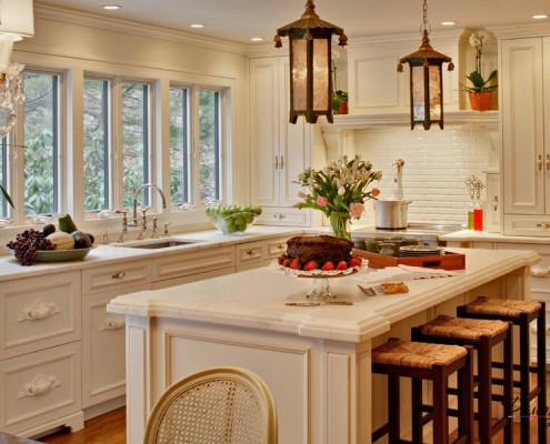 Один из оптимальных вариантов освещения кухни – это установка подвесных светильников над самим островком, а точечных – вдоль всего периметра помещения.