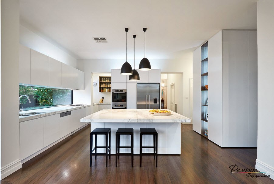 Для кухни с островком необходимо специальное освещение. От того, насколько грамотно будет подсвечена каждая из зон, зависит функциональность и удобство работы на кухне.