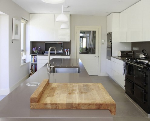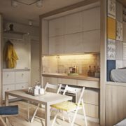 - сэкономить пространство также поможет встраиваемая мебель и техника, а столешницы основной гарнитуры или островка могут быть складными.