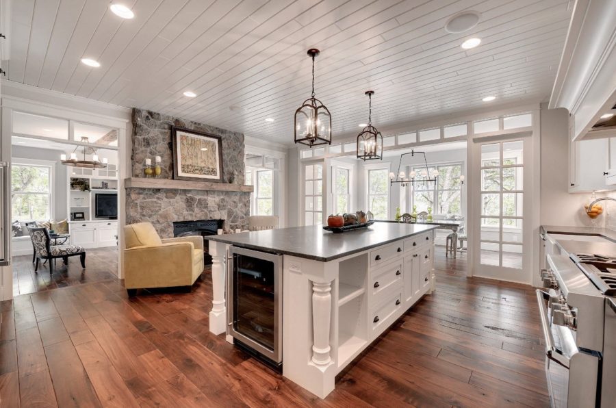Одно из решений для удачного зонирования большой совместной комнаты — построить так называемый кухонный остров с плитой и столешницей. Такое расположение кухни обеспечивает свободное общение на всем открытом пространстве. Человек, готовивший еду, присоединяется к людям, сидящим за столом, чтобы без проблем участвовать в беседе.
