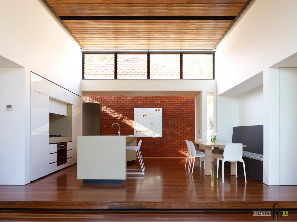 Планировка делается, исходя из имеющихся размеров комнаты. Стиль модерн универсален, подойдет и для просторного помещения, и для ограниченного пространства. Для правильной планировки, кухонную комнату следует разбить на зоны.