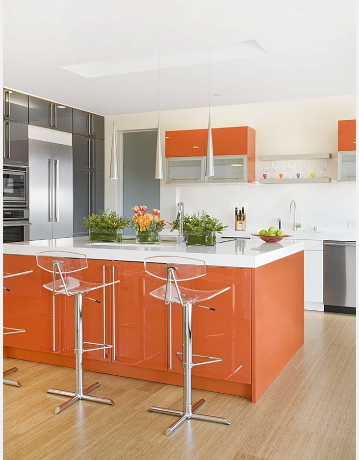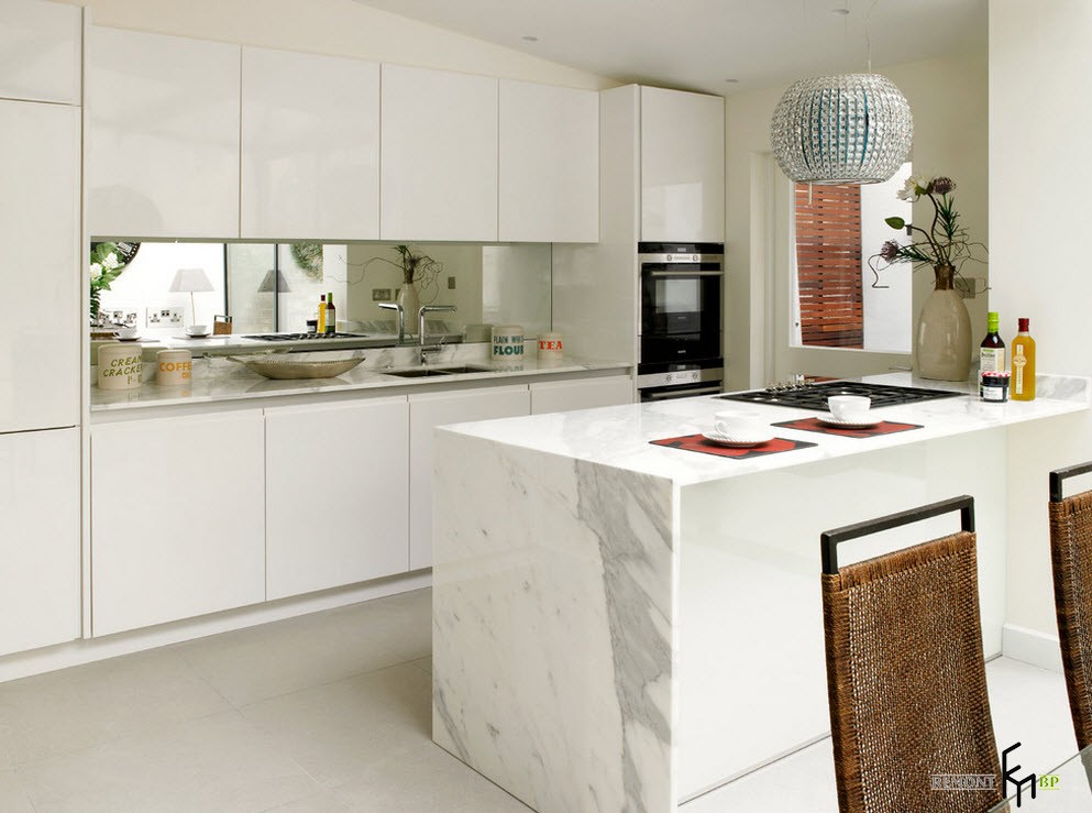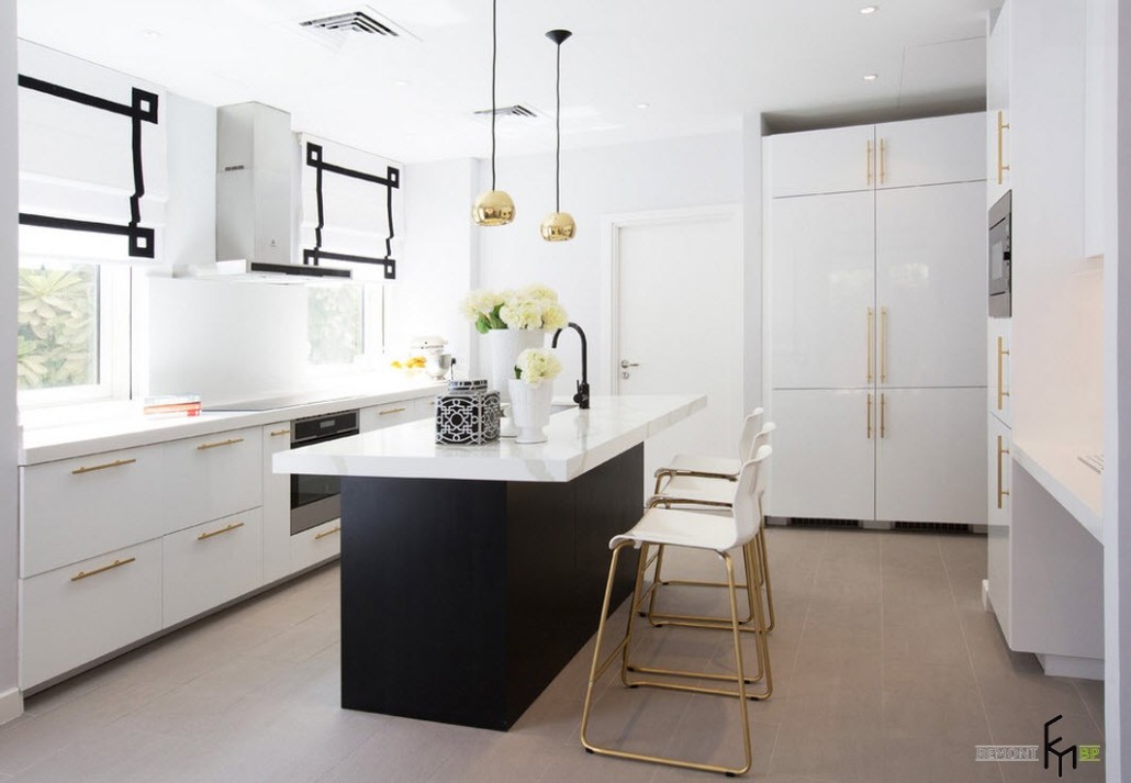 Обычно это выражается через цветовую палитру интерьера. Монохромные цвета помогут вам превосходно украсить помещение кухни. Это могут быть и мебельный гарнитур, и отдельные поверхности стен, потолка, пола. Конечно, чаще всего сам цвет кухонного гарнитура и является основным украшением комнаты.