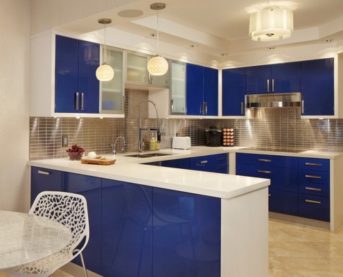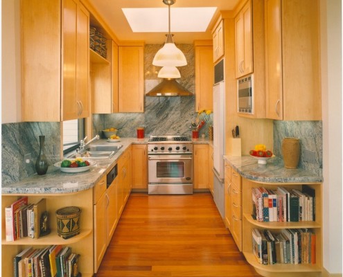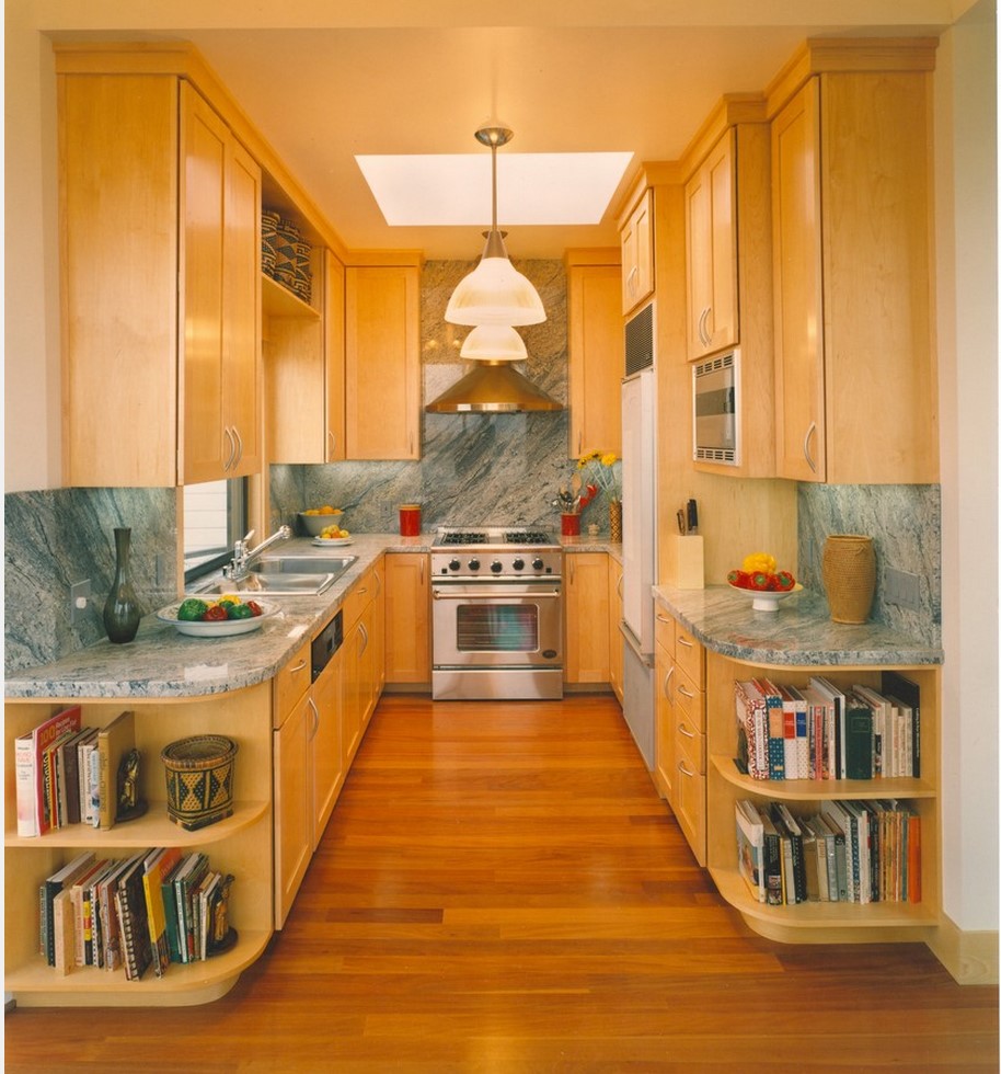 П-образное расположение имеет аналогичные плюсы, но гарнитуры такого вида не очень вписываются в небольшом помещении, так как «съедают» приличное пространство, занимая место сразу возле трех стен. Комфортной такую кухню нельзя назвать. Хотя понятие «небольшой комнаты» у каждого человека свое. Вполне возможно, что ваша «небольшая комната» вполне подойдет и для П-образного мебельного гарнитура, главное, чтобы расстояние между параллельно расположенной мебелью составляло приемлемую для вас величину (специалисты рекомендуют не менее двух метров).