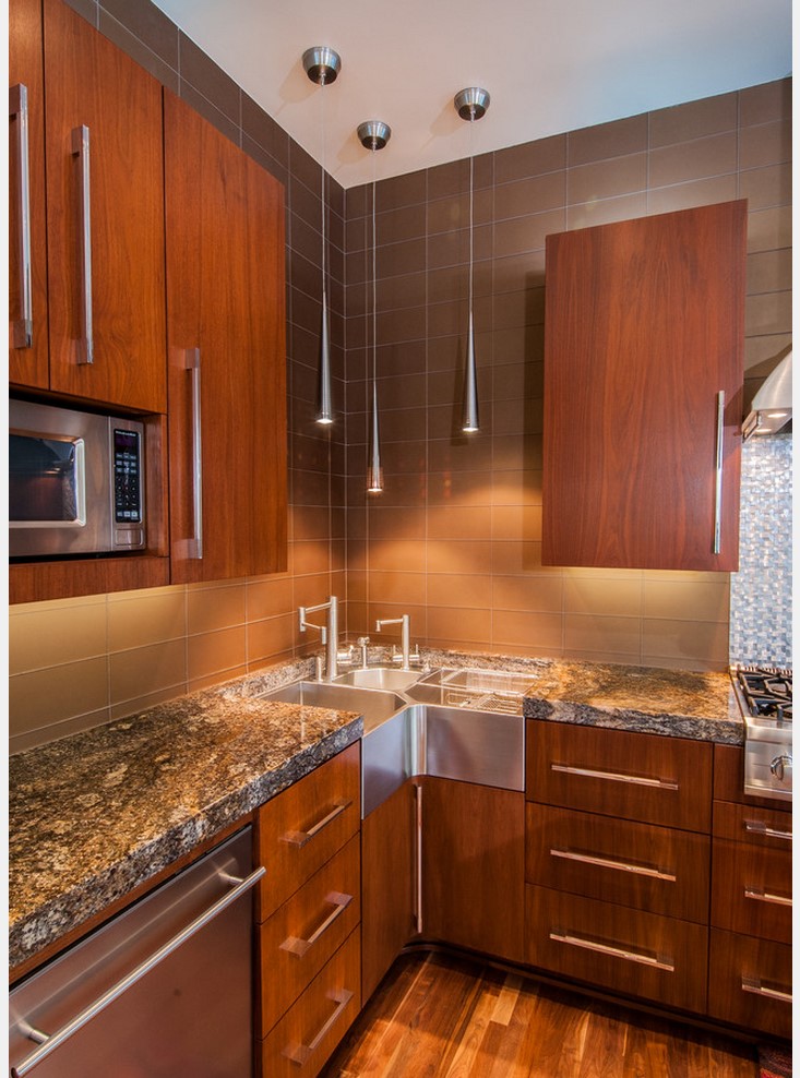 При небольшой кухонной комнате, самым оптимальным вариантом является угловая расстановка мебели гарнитура. Стоит отметить, что этот вариант планировки самый популярный, так как позволяет легко реализовать основополагающую концепцию стиля – функциональность, практичность и оптимальность интерьера.