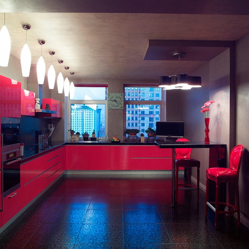 Характерной чертой фьюжн является сочетание форм и дорогих материалов с дешевыми, благородными и обычными продуктами интерьерного дизайна. Этот стиль черпает вдохновение из народных мотивов, особенно ярких, красивых цветов, которые должны присутствовать в оформлении фьюжн. На этой кухне разрешены практически все декоративные и композиционные сочетания: