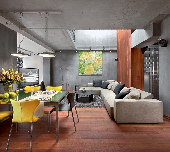Главная особенность полов в стиле конструктивизм — разделение на разные функциональные зоны, то есть напольные покрытия для гостиной, спальни, кухни, прихожей и ванной комнаты — чаще всего это разные материалы. Для кухни используйте плитку, которая не боится влаги, но также можете постелить линолеум, ламинат и т. д. Если вы используете линолеум, то не бойтесь использовать разные декорации.
