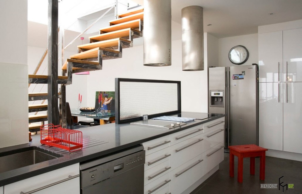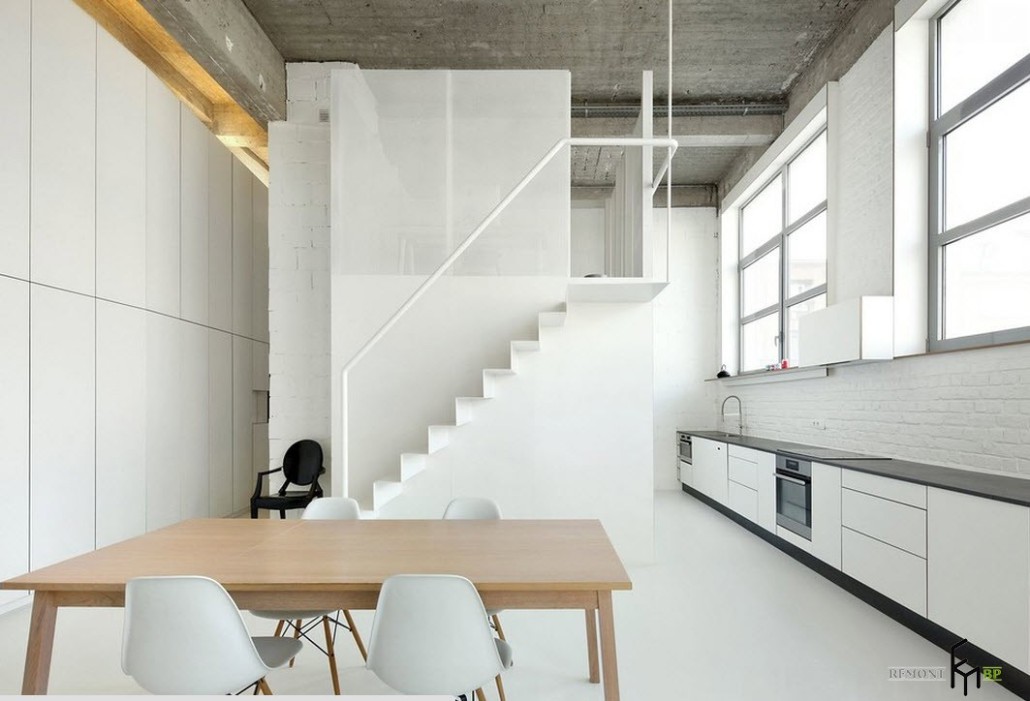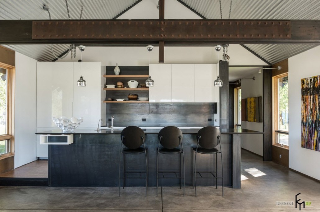 Индустриальный стиль кухни в полной мере оценят те, кому по душе просторные помещения с достаточным количеством света и воздуха. Высокие потолки, выкрашенные в белый цвет, придают комнате дополнительный объем. Деревянные балки, трубы, стропила и опорные столбы, имеющиеся в квартире, не придется прятать или маскировать. Благодаря именно этим атрибутам, кухонное помещение приобретет типичный «заводской» вид.