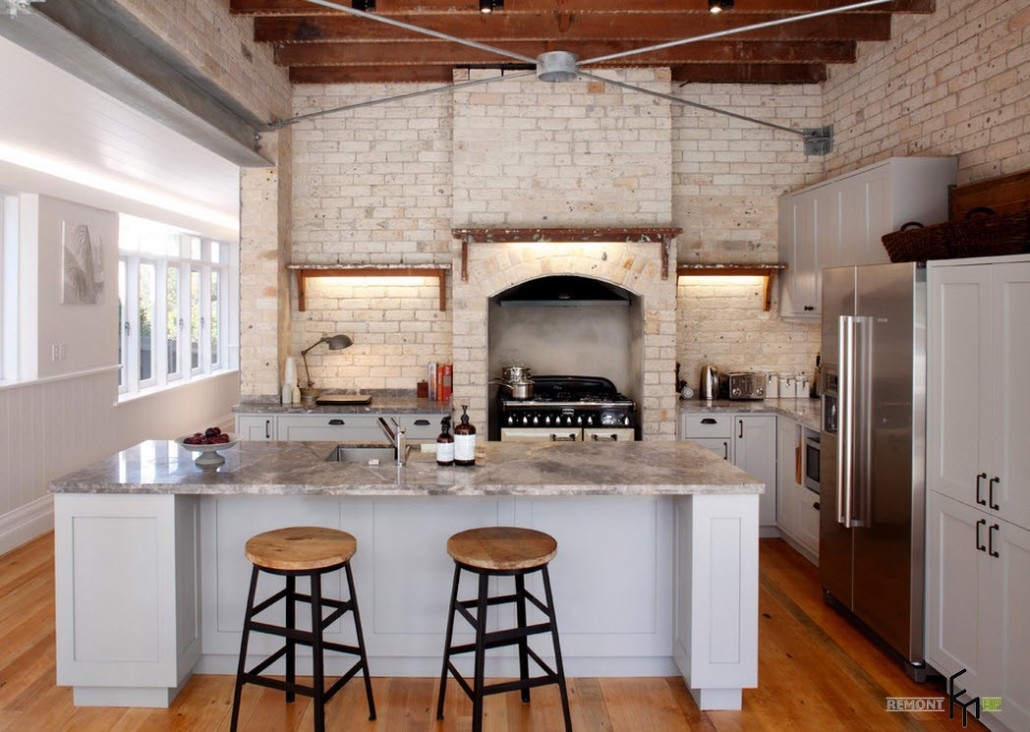 При отделке типичной кухни в стиле лофт применяются самые простые и доступные материалы: кирпич, бетон, необработанная древесина, стекло и металл. Замечательно, если в помещении имеются неоштукатуренные кирпичные стены и неровные бетонные полы. В некоторых случаях такие поверхности создаются искусственным способом – при помощи материалов, имитирующих кирпичную кладку или грубую штукатурку.