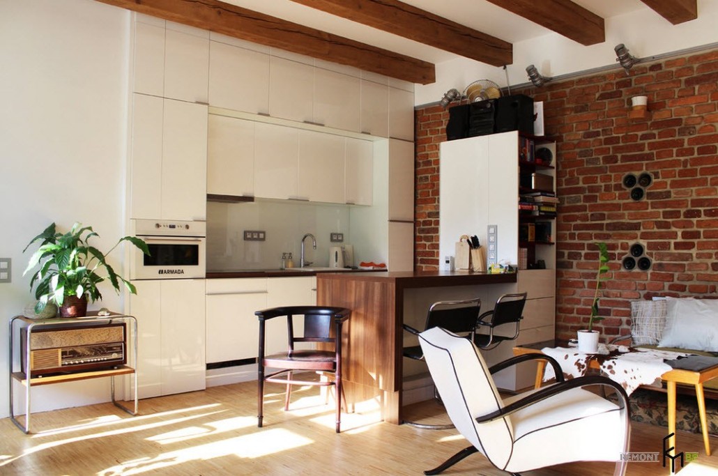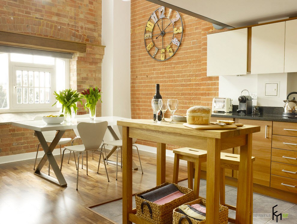 1. При отделке такого кухонного помещения дизайнеры рекомендуют выделить одну из стен при помощи окрашивания в другой цвет. Имеется еще один вариант: можно оставить поверхность в первозданном виде либо придать ей вид живописной кирпичной кладки или грубой штукатурки, воспользовавшись доступными декоративными материалами. Если решено создать на кухне имитацию стен «под кирпич», рекомендуется покрыть их матовой эмульсией белого или кремового цвета.