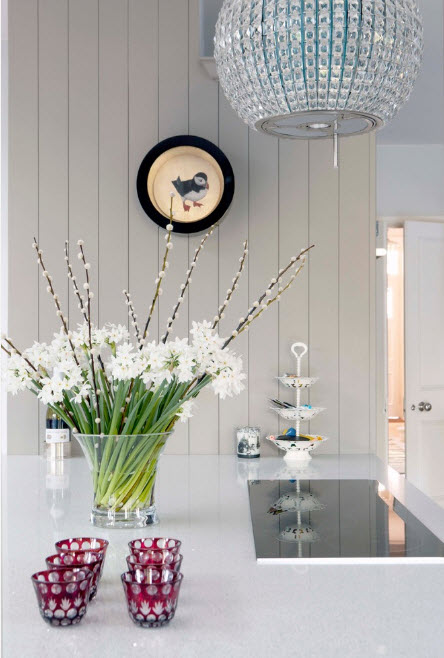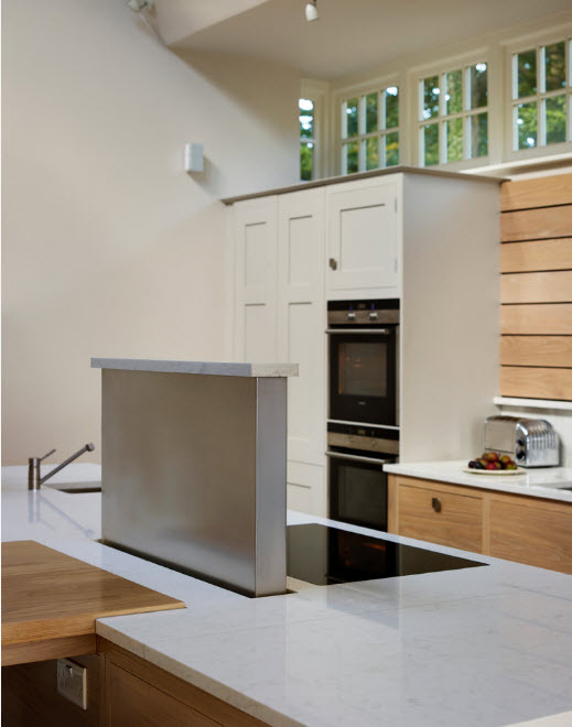 Панель вытяжки, служащая для воздухозабора, часто продлевается в одну из сторон от варочной поверхности. Получается некое подобие полочки, на которой можно хранить необходимые кухонные аксессуары. Как правило, такая поверхность оснащается светильниками. В результате вы получаете источник света не только над варочной панелью, но и мойкой или разделочным местом (в зависимости от обустройства кухонного острова).