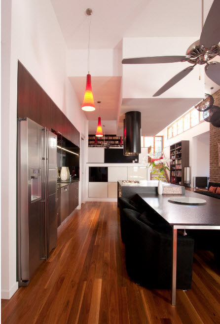 Оригинально смотрится вытяжка, которая является частью вентиляционной трубы. Подобная конструкция позволяет сэкономить свободное пространство над рабочей зоной кухни, хоть и снижает производительность работы самого прибора.