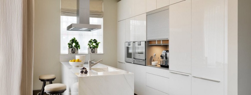 Белый цвет и его деликатные оттенки – ретроспектива и будущее минималистских дизайнов. Наряду с серым и его нюансами на протяжении последнего десятилетия ахроматическая схема активно эксплуатировались в мебельных экспозициях. Сейчас отношение к универсальной палитре заметно изменилось, и темные панели активно внедряются на территорию кухни. Черно-светлые поверхности динамичным контрастом придают шарма и создают другой формат, не смотря на универсальность комплектации.