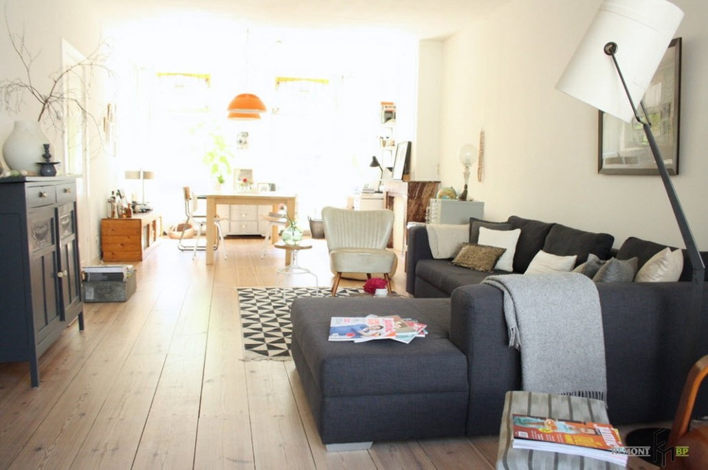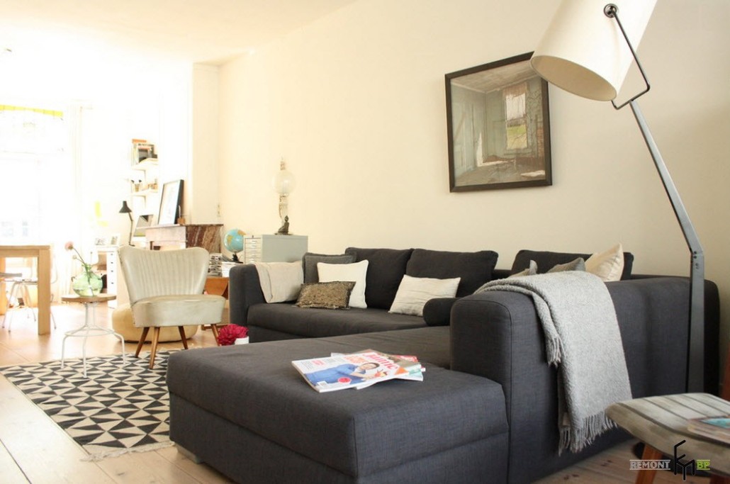Большой мягкий диван, обтянутый практичной серой тканью, при необходимости можно увеличивать в размерах. Серо-белый лоскутный коврик превосходно смотрится рядом с диванной обивкой и текстилем того же цвета. Белое кресло в комплексе с торшером и подушками дополняет общую цветовую гамму. Маленький журнальный столик с круглой столешницей на трех изогнутых ножках выполняет исключительно декоративную функцию: на его поверхности размещается сосуд для живых цветов оригинальной формы.