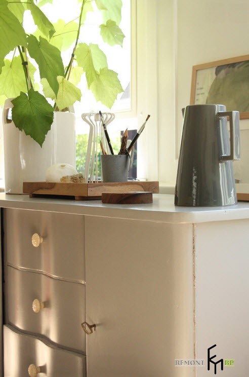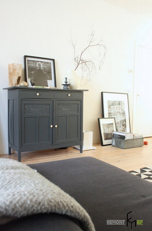 Напротив зоны отдыха располагается небольшой старинный комод серо-фиолетового цвета, служащий для хранения всевозможных вещей.