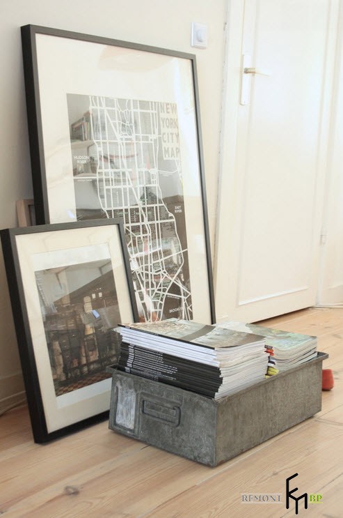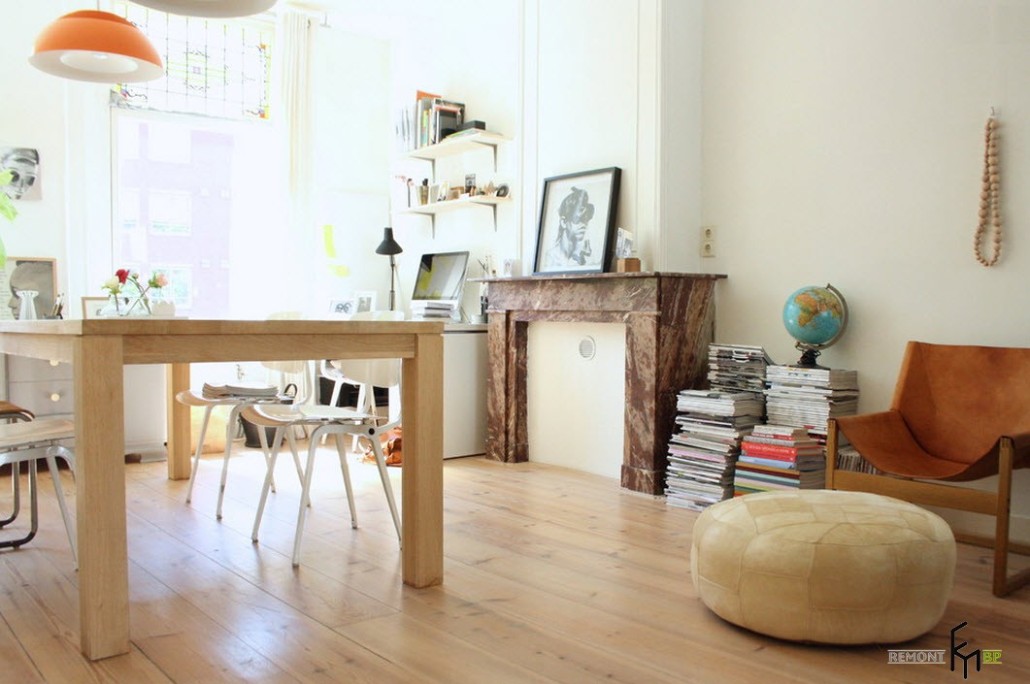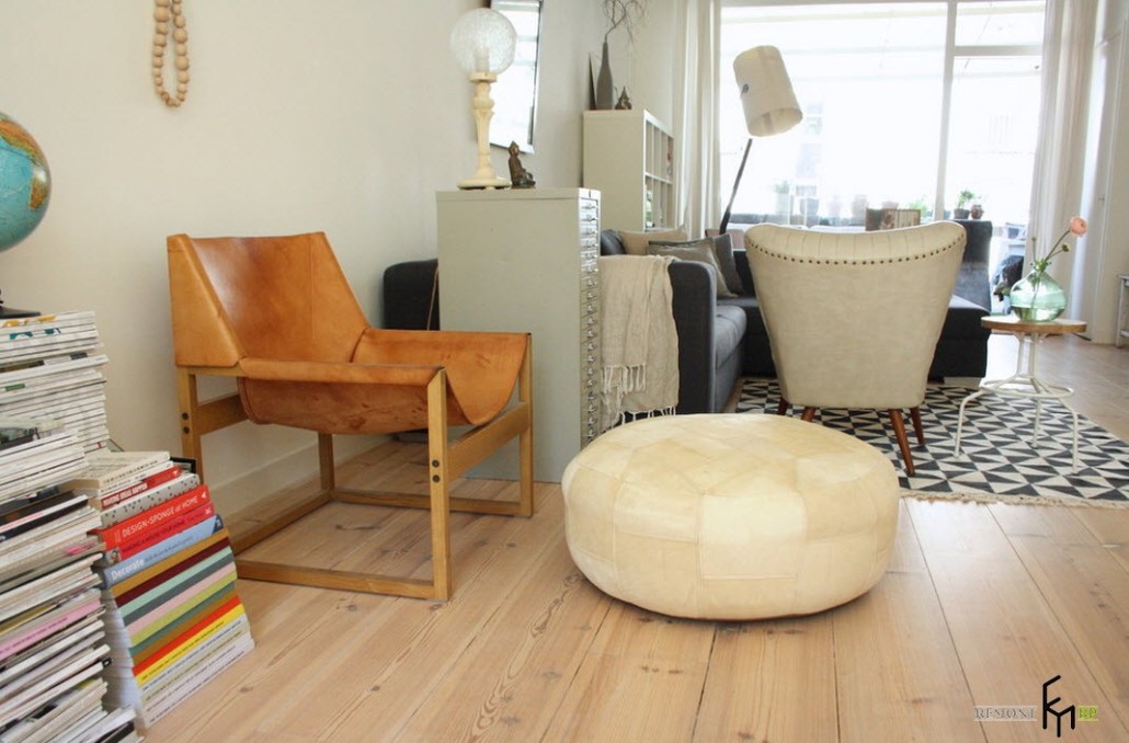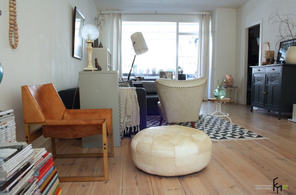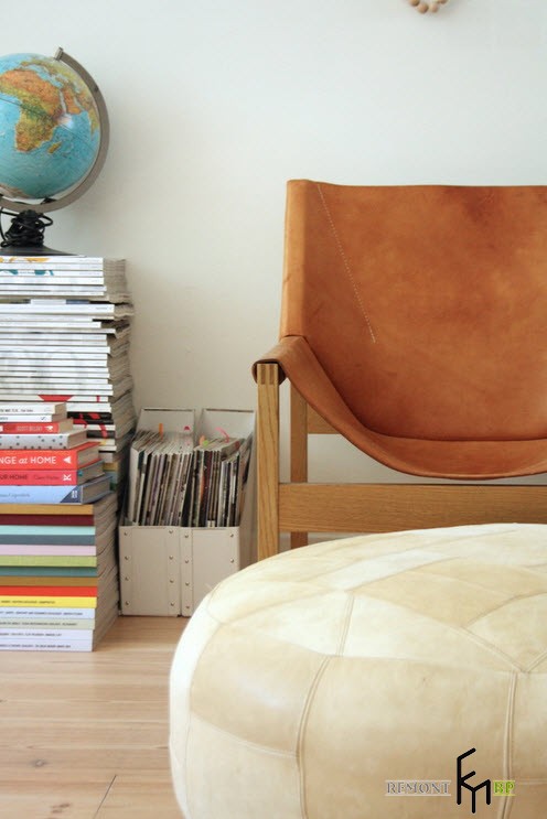 В этой квартире нет определенного места для чтения книг и периодической литературы. Расположиться с книжкой в руках можно как справа от дивана, так и с левой стороны от него. В одной части комнаты хозяина жилища поджидает простое деревянное кресло незамысловатой формы, маленький импровизированный столик и открытый шкаф для хранения книг, а также других, не менее важных предметов.