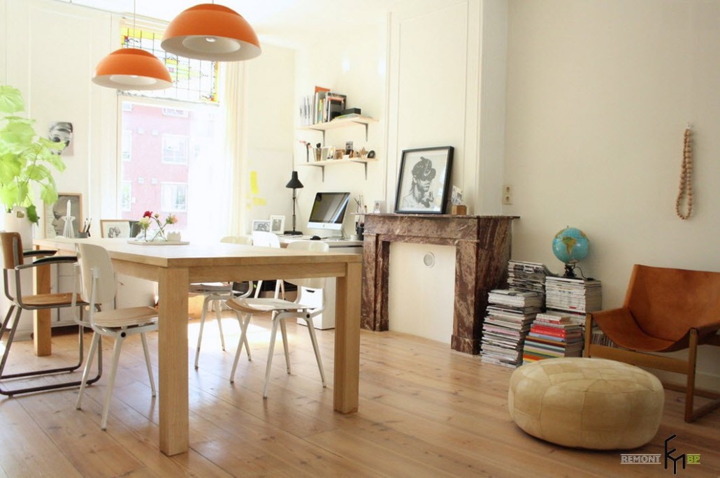 – две подвесные лампы приглушенного оранжевого цвета над обеденным столом;