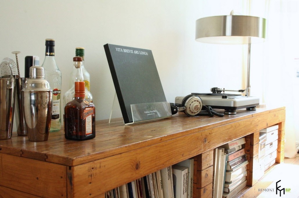 Особого внимания заслуживает продолговатый шкаф, стоящий на полу. Его поверхность используется для хранения множества удивительных предметов. Здесь можно увидеть старинный музыкальный проигрыватель пластинок с наушниками, бутыли из-под спиртных напитков и металлическую настольную лампу оригинальной округлой формы.