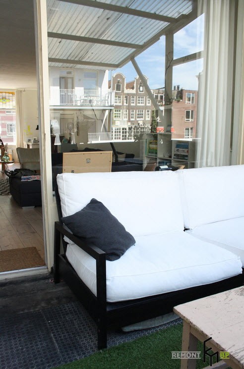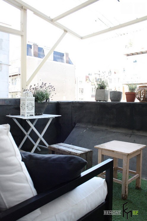 Кроме того, в гостиной имеется выход на лоджию – довольно большое, прекрасно освещенное помещение. Здесь приютились небольшой диванчик с белой обивкой и старая мебель в стиле ретро: устойчивый табурет, подставка и небольшой складной столик. Пол в комнате устлан теплым покрытием, напоминающим мягкий травяной покров. В помещении также имеется несколько горшков с живыми цветами.