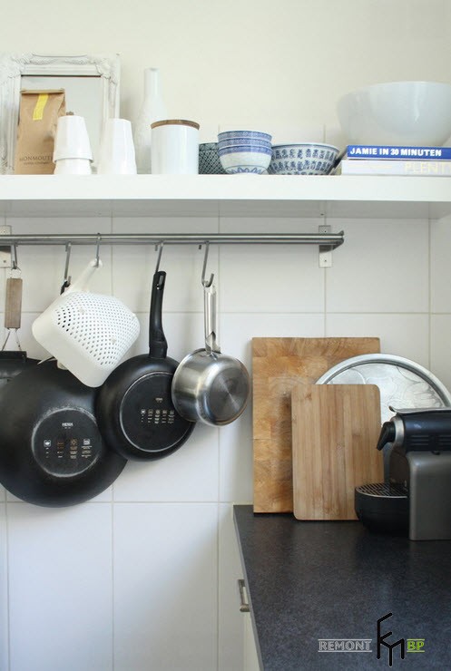 Кухонное пространство в этой квартире так же, как и спальня, занимает мало места. Здесь все предельно функционально: имеется зона для приготовления и разогрева незамысловатой пищи и несколько мест для хранения самой необходимой кухонной утвари.