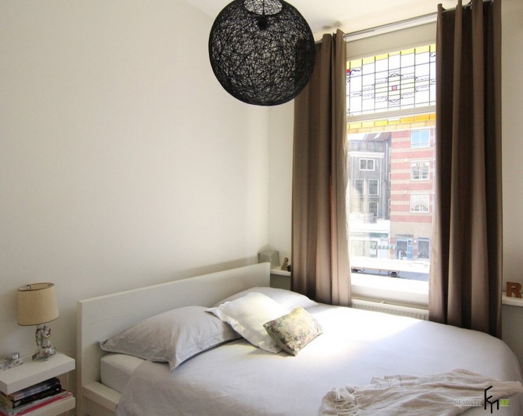 Интерьер комнаты выдержан в молочно-кофейных тонах. Наиболее насыщенный цвет имеют шторы. Благородный коричневый оттенок портьер прекрасно сочетается с пастельными тонами стен, мебели и текстиля. Несколько необычно на общем фоне смотрится люстра, имеющая вид большого черного шара, изготовленного из ниток.