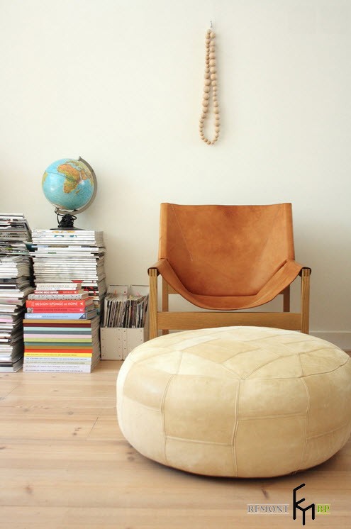 Кресло, стоящее в этой части комнаты имеет менее аскетический вид: оно изготовлено из дерева и мягкой упругой кожи. Для освещения этой зоны можно воспользоваться специальной настольной лампой, стоящей на металлической поверхности шкафа.