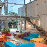 Благодаря окну, расположенном в крыше, в зоне отдыха гостиной достаточно естественного освещения, чтобы иметь возможность не только находиться в комнате без включения осветительных приборов в светлое время суток, но и для того, чтобы читать, сидя на диване. Потолок помещения неслучайно был оставлен без отделки, бетонные поверхности – одна из особенностей оформления пространств в индустриальном ключе.