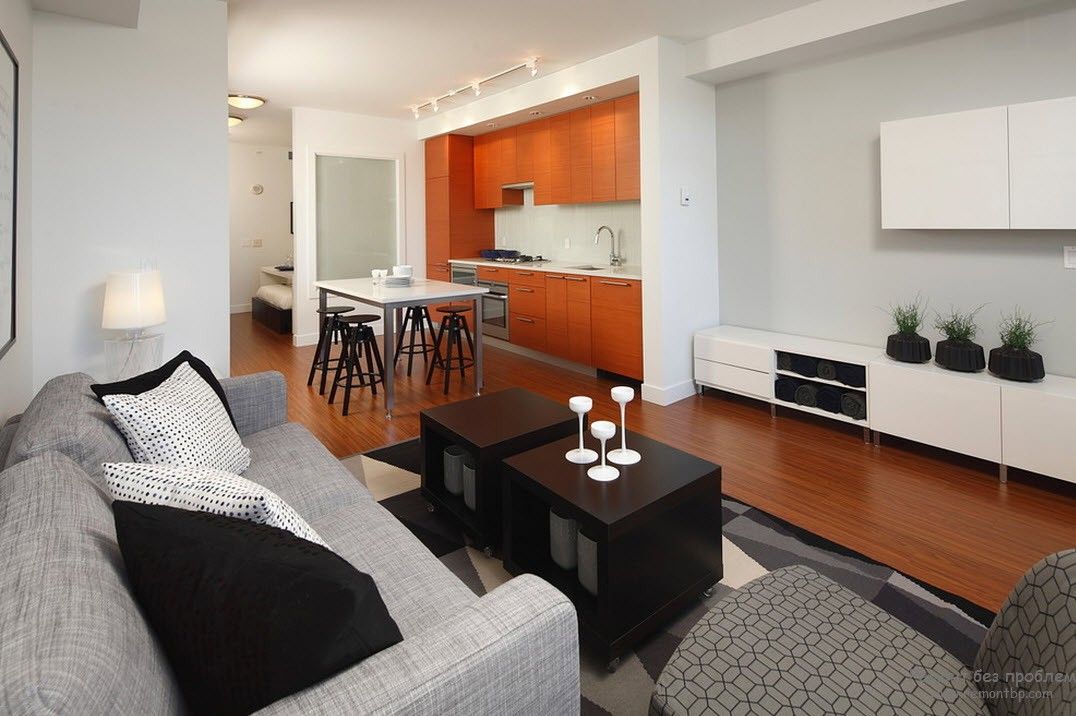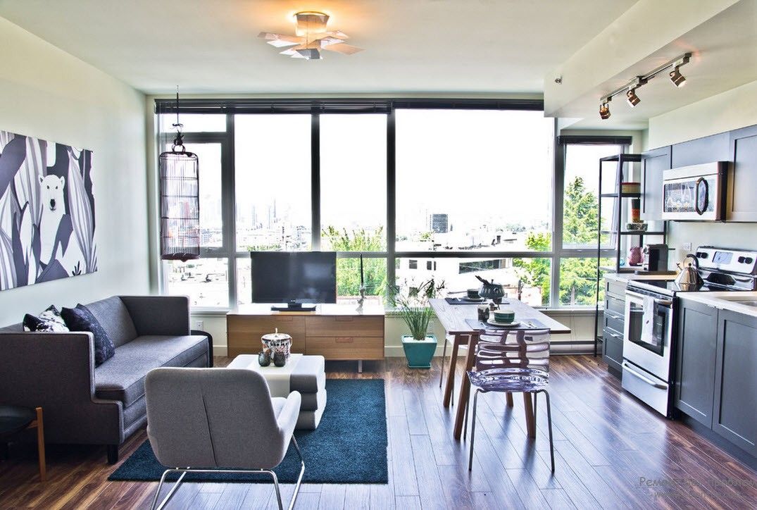 Очень часто такой малогабаритный вариант жилья имеет концепцию минимализма. Расставьте только необходимую мебель и минимум декора, это позволит сохранить немного пространства, но и вид при этом останется приятным.