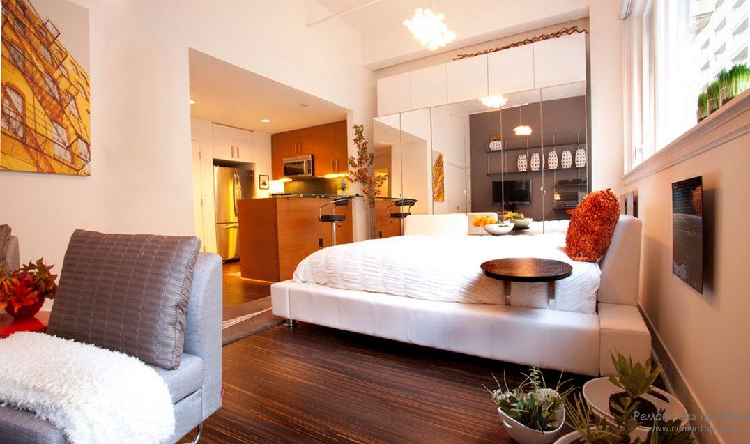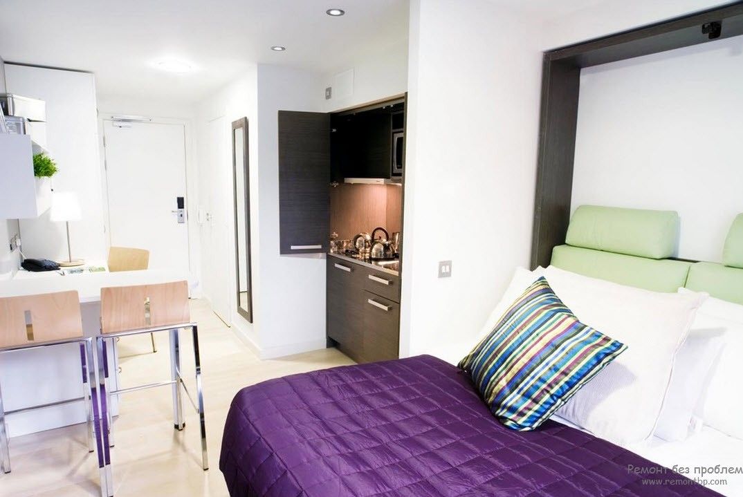 Что касается небольших квартир-студий, то это, конечно же, помещение с маленьким метражом. Такой недостаток квадратуры тоже можно решить, большая часть мебели может быть скрыта раздвижными панелями, или, например, сделайте шкаф, встроенный в стену.