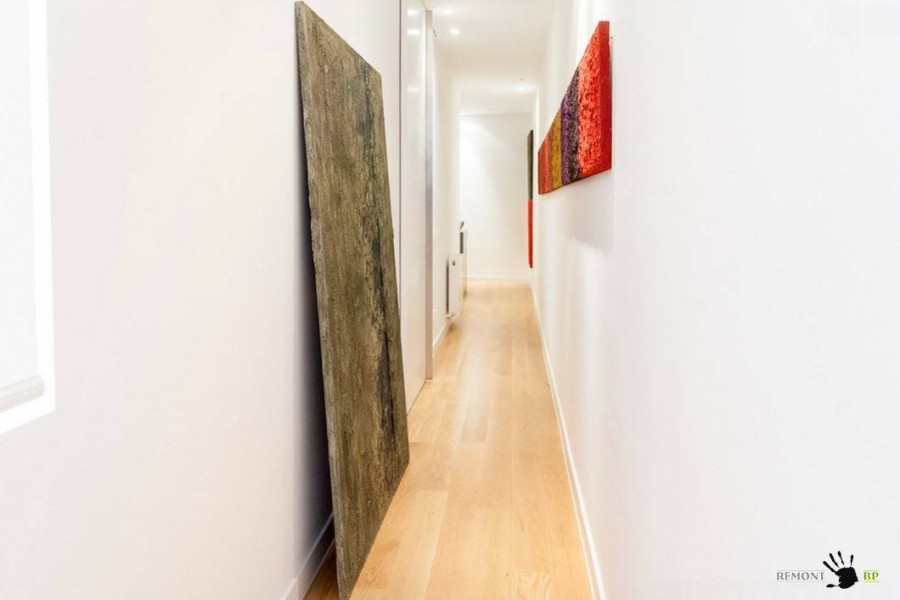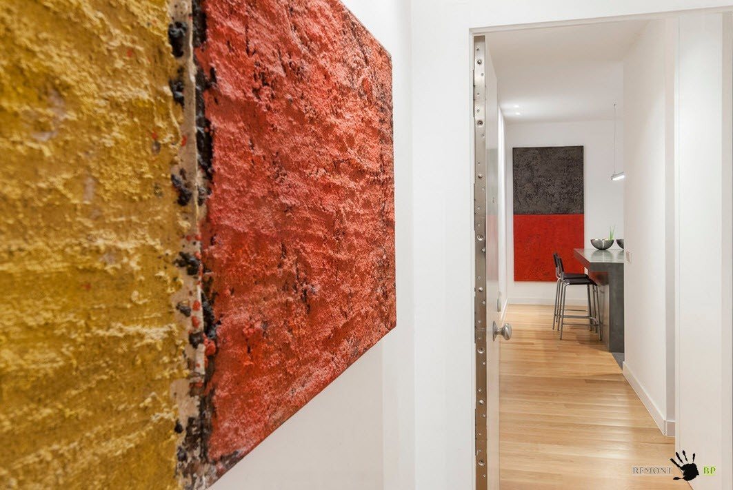 Проникнув через входную дверь в квартиру, мы оказываемся в белоснежном узком и длинном коридоре. Первое же помещение в испанских апартаментах дает немалое представление о том, каким способ будут оформлены и остальные комнаты. Белоснежная отделка потолка и стен, аналогичный цвет дверей, теплые древесные оттенки напольного покрытия – все эти способы оформления внутренних помещений будут повторены как в личных, общих, так и в утилитарных комнатах мадридской квартиры.