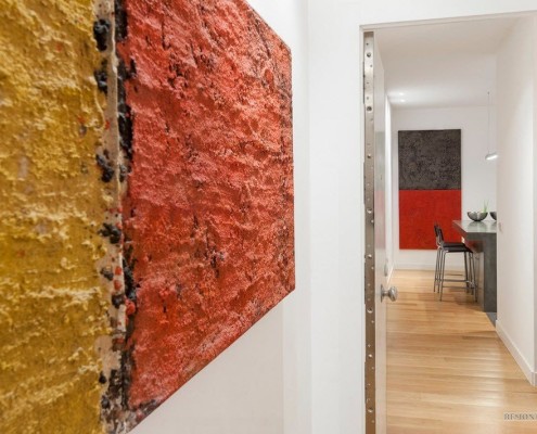 Изюминкой интерьера всей квартиры являются оригинальные картины, обладающие четкой геометрией, но при этом весьма экспрессивной фактурой. Яркие, насыщенные цвета, оригинальная подача – на белом фоне такой арт-объект смотрится особенно выигрышно.