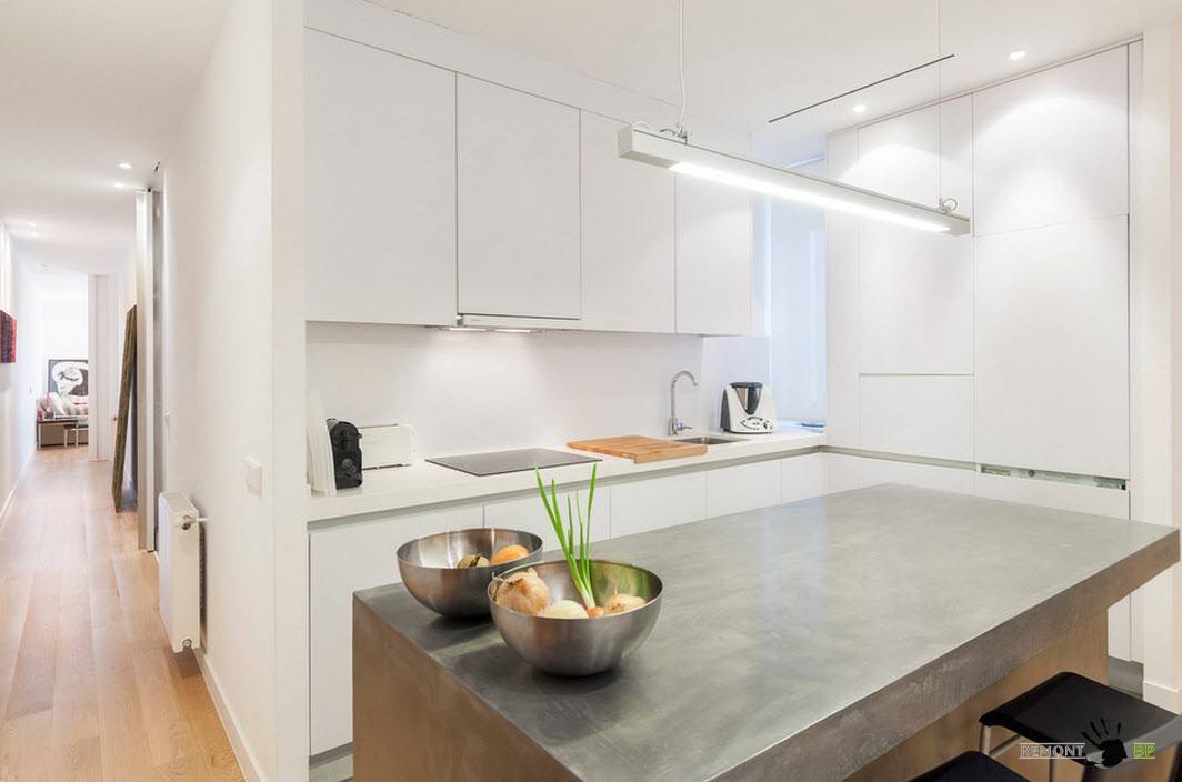 Через открытые двери в коридоре мы проникаем в небольшое кухонно пространство, оформленное в духе всей испанской квартиры в белоснежные тона. Кухонный гарнитур с белыми гладкими фасадами разбавлен лишь интеграцией бытовых приборов и мойки. Угловая компоновка рабочих поверхностей, систем хранения и техники позволила уместить в небольшой кухне достаточно вместительный остров. И даже в кухонном пространстве мы видим использование оригинального настенного декора – колоритные тона и фактурное исполнение нашли отражение и в кухонной эстетике.