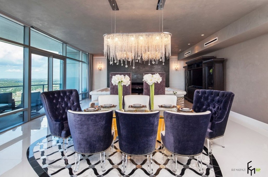 Столовая зона условно выделена ковром с черно-белыми ромбами. К стеклянному столу придвинуты глубокие кресла из бархатного темно-синего комплекта и мягкие стулья с белой кожей. В сопровождении «хрустального» света, льющегося из низко подвешенной люстры, здесь каждый вечер собирается семья.