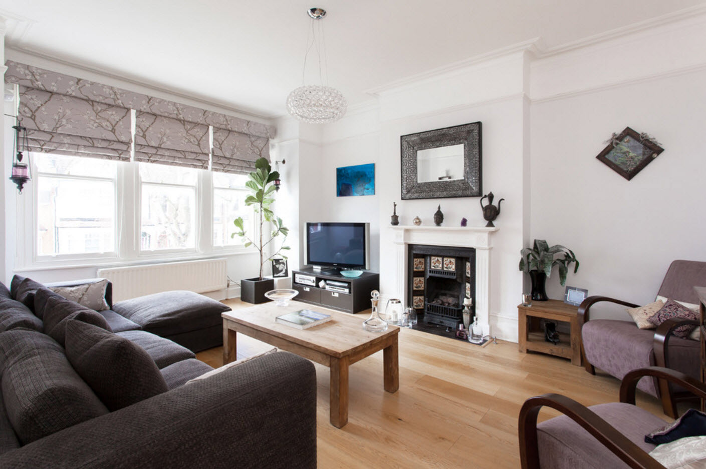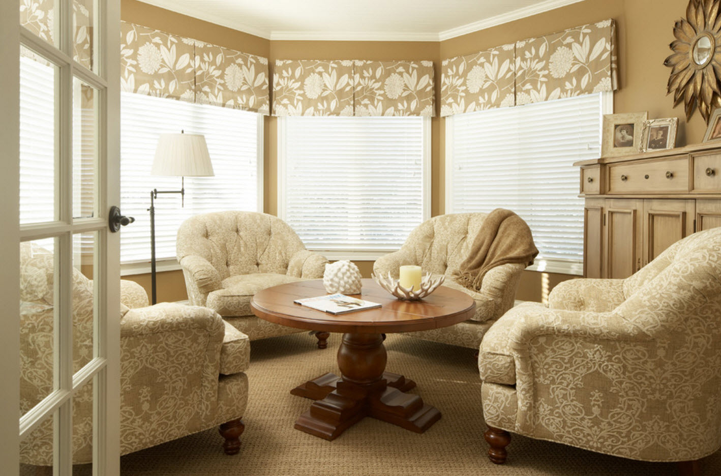 Римские шторы с жестким ламбрекеном – достаточно лаконичный и даже строгий вариант драпировки для окон гостиной. Привнести нотки романтизма и элегантности поможет ткань с растительным рисунком, импровизированными узорами или геометрическим орнаментом с плавными линиями.